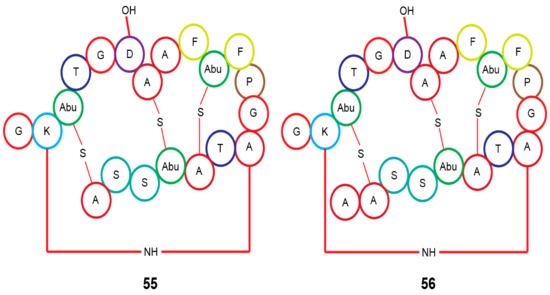 In silico analysis of the genome of Actinomadura sp. RB29 from Macrotermes natalensis, using antiSMASH and tandem MS2 data submitted to Global Natural Product Social Molecular Networking (GNPS), and subsequent RiPPquest processing revealed the presence of two lanthipeptides with proposed structures of rubrominin A (55) and B (56) [70]. Their gene cluster resembles that of cinnamycin (Figure 7) [100,101,102]. Except for the Actinobacteria microorganisms, the termite family has a large range of microbiota that has not been thoroughly investigated in terms of their chemical capacity as presented here. The bulk of their chemical structures consists of peptides and isoflavonoids, which makes them peculiar.