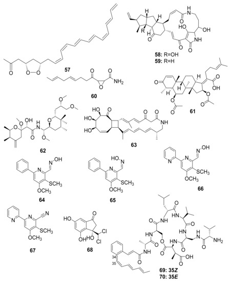 Actinobacteria, particularly Streptomyces, have been described as having a chemical defense mechanism that produces antimicrobial compounds that aid in the fight against infectious disease. Mycangimycin (57), frontalamide A (58), and frontalamide B (59), for example, were isolated from a Streptomyces strain that was symbiotically associated with the southern pine beetle (Dendroctonus frontalis). Mycangimycin inhibits the beetles’ antagonistic fungus Ophiostoma minus and has potent antimalarial activity. Frontalamide A and frontalamide B have antifungal properties [87,88].