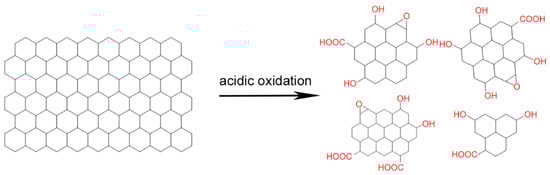 Acidic oxidation is a relatively simple method in which mainly inorganic carbon sources are oxidized by exposure to HNO3, H2SO4, NaNO3, KMnO4 or other oxidizers at temperatures up to 140 °C. Reaction times to break down a carbon source into carbon quantum dots range from 12 to 48 h [21,24,25,26,27,28,29,30,31,32,33,34,35,36]. The acidic conditions combined with high temperatures necessitate extreme care when applying acidic oxidation to synthesize carbon quantum dots. Different carbon sources, such as coal [25,27], fullerene C60 [26], carbon nano-powders [24,29,30,34], carbon fibers [35], candle soot [21] and graphite [31,32,33] can be applied for acidic oxidation, resulting in carbon quantum dots. Typically, cleavage occurs at carbon-carbon bonds, introducing negatively charged, oxygen-containing groups, such as C-O, C=O or O-H, onto the surface of the resultant carbon quantum dots (Figure 1). Thus prepared, carbon quantum dots are hydrophilic and highly suitable for further chemical modification [25,26]. In order to obtain a uniform size distribution and remove acid residues and molecular intermediates, carbon quantum dots synthesized by acidic oxidation usually need purification (Figure 2) [45].