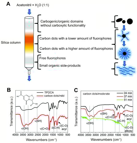 Purification of carbon quantum dots, obtained by oxidation of cysteine using citric acid under hydrothermal conditions, via column chromatography: (A) Different fractions obtained in the purification of carbon quantum dots by chromatography. (B) FTIR spectra of dried free-floating fluorophores (TPDCA) first leaving the chromatography column and carbon quantum dots synthesized during acidification for 3 h at 150 °C (mild acidification). (C) FTIR spectra of different fractions of carbon quantum dots synthesized during acidification for 6 h at 200 °C (moderate acidification), obtained after different retention times in the chromatography column. Note the disappearance of the absorption bands due to free-floating fluorophores. Reproduced with permission from Ref. [45], copyright Royal Society of Chemistry, 2019.