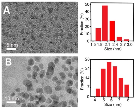 Dialysis of carbon quantum dots hydrothermally synthesized using graphite powders to obtain quantum dots with a uniform size distribution: (A) TEM micrographs and size distribution of carbon quantum dots that passed through a dialysis bag, showing smaller particles with a uniform size distribution. (B) TEM micrographs and size distribution of carbon quantum dots that did not pass through a dialysis bag, showing larger particles with a wide size distribution. Reproduced with permission from Ref. [52], copyright Elsevier, 2014.