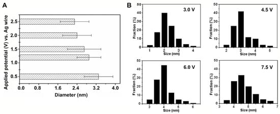Size control in the electrochemical synthesis of carbon quantum dots: (A) Diameters of carbon quantum dots electrochemically top-down exfoliated from carbon sheets, applying different voltages. Reproduced with permission from Ref. [63], copyright Wiley, 2011. (B) Diameters of carbon quantum dots electrochemically obtained in a bottom-up approach from ethanol, applying different voltages. Reproduced with permission from Ref. [66], copyright Wiley, 2014.