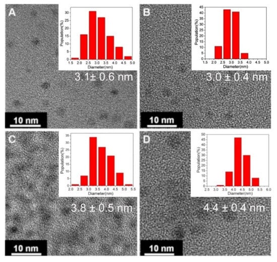 TEM micrographs of carbon quantum dots prepared from different organic precursors in a soft–hard template nanoreactor consisting of Pluronic P123 micelles and mesoporous silica. Carbon quantum dots were synthesized from: (A) 1,3,5-trimethylbenzene, (B) diaminebezene, (C) pyrene and (D) phenanthroline. The insets show the size distributions. Reproduced with permission from Ref. [69], copyright Royal Society of Chemistry, 2013.