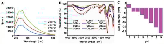 Physico-chemical properties of carbon quantum dots prepared from organic reagents: (A) Fluorescence spectra of carbon quantum dots pyrolytically synthesized from spermidine at different temperatures. Reproduced with permission from Ref. [37], copyright American Chemical Society, 2017. (B) Similarities in infrared absorption spectra between gentamicin sulfate and carbon quantum dots (CQDT) derived through calcination at different temperatures (T), demonstrating preservation of the active structure of gentamicin sulfate. Reproduced with permission from Ref. [39], copyright Royal Society of Chemistry, 2020. (C) Zeta potentials at different pH of carbon quantum dots hydrothermally synthesized from tri-basic citric acid and dicyandiamide. Reproduced with permission from Ref. [77], copyright Royal Society of Chemistry, 2014.