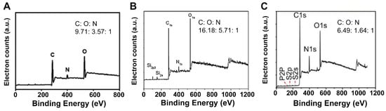 XPS spectra of carbon quantum dots prepared from natural carbon sources: (A) XPS spectra of carbon quantum dots derived from Artemisia argyi leaves. Reproduced with permission from Ref. [78], copyright Royal Society of Chemistry, 2020. (B) XPS spectra of carbon quantum dots derived from flour. Reproduced with permission from Ref. [83], copyright Elsevier. (C) XPS spectra of carbon quantum dots derived from Lactobacillus plantarum bacteria. Ratios presented are between at% of the elements indicated. Reproduced with permission from ref. [23], copyright Frontiers, 2018.