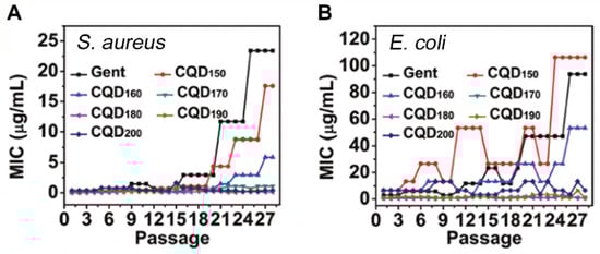 In addition to antibacterial efficacies summarized for carbon quantum dots in Table 2, it is important to notice that carbon quantum dots not only show good antibacterial activity but also possess a reduced risk for the development of antibiotic resistance compared to antibiotics (Figure 8) [39].