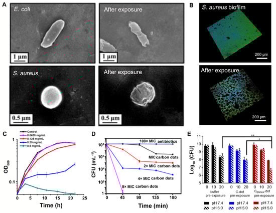 Examples of the antibacterial activity of carbon quantum dots according to different antibacterial mechanisms and synergistic use with antibiotics: (A) Cell wall damage to E. coli and S. aureus, inflicted upon exposure to cationic carbon quantum dots, pyrolytically synthesized from spermidine. Reproduced with permission from Ref. [37], copyright American Chemical Society, 2017. (B) Disruption of the EPS matrix of a S. aureus biofilm by carbon quantum dots synthesized from carbon fibers by acidic oxidation, causing biofilm dispersal. Reproduced with permission from Ref. [94], copyright American Chemical Society, 2019. (C) Growth inhibition of P. aeruginosa upon exposure to different concentrations of carbon quantum dots, hydrothermally synthesized from aminoguanidine and citric acid. Reproduced with permission from Ref. [84], copyright American Chemical Society, 2019. (D) Killing of stationary-phase MRSA upon exposure to nitrogen-doped carbon quantum dots, hydrothermally synthesized from a bis-quaternary ammonium salt, as compared with killing achieved by penicillin and gentamicin. MRSA were exposed to different concentrations of carbon quantum dots. Reproduced with permission from Ref. [47], copyright American Chemical Society, 2019. (E) Pre-exposure of S. epidermidis ATCC12228 biofilms to carbon quantum dots without (C-dots) and with 2,3-dimethylmaleic-anhydride (DMMA) functionalization (CDMMA-dots) yielded enhanced killing upon 72 h exposure to vancomycin at pH 5, as occurring in infectious biofilms. * p ˂ 0.05 and ** p ˂ 0.01 indicate significant differences with respect to vancomycin in absence of prior carbon dot exposure or prior exposure to C-dots (one way ANOVA). Reproduced with permission from Ref. [75], copyright ELSEVIER, 2020.