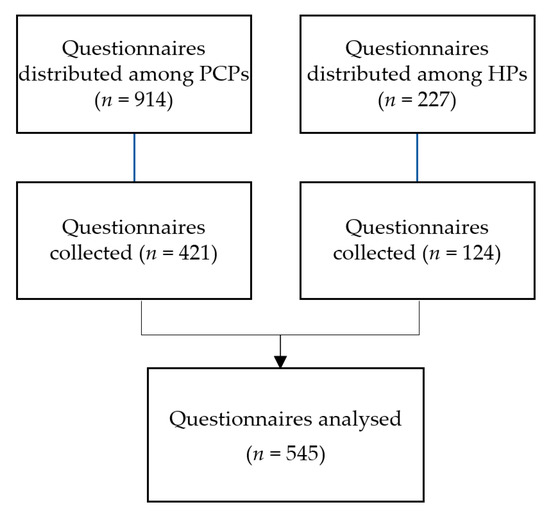 The overall response rate was 47.8%: of the PCPs; 421 answers were obtained, which corresponded to an overall response rate of 46.1%; 124 of the HPs invited accepted to participate in the study, corresponding to an overall response rate of 54.6%.
