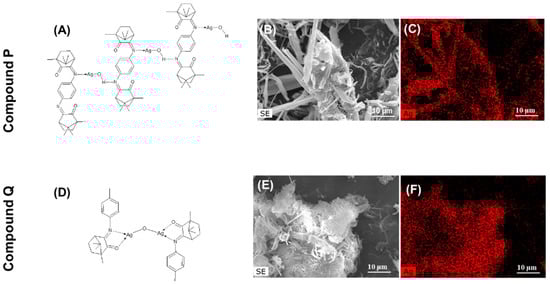 Physicochemical characterization of compounds P and Q; schematic structural arrangement (A,D), SEM micrographs (B,E), and EDS map of silver (C,F) of compound P and Q, respectively.