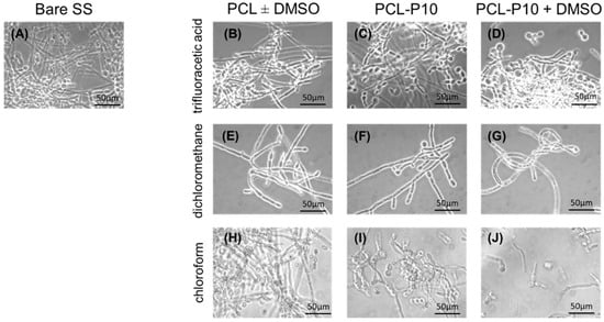 Analysis of planktonic C. albicans cells in the presence of different PCL coating formulations; representative optimal images of the planktonic cells observed by optical microscopy, with a magnification of 1000×, when in the presence of bare stainless steel (control, (A); PCL formulations using trifluoroacetic acid (B), dichloromethane (E) or chloroform (H), without or with DMSO; coatings only with PCL (B,E,H) or with embedded compound P (PCL-P10) without DMSO (C,F,I) or with DMSO (D,G,J).