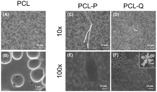 In the absence of complexes P or Q, the PCL coating obtained from solutions with DMSO displayed cavities (Figure 4A) not observed in typical PCL coatings formed in the absence of DMSO (SI, Figure S2B). The presence of DMSO alters the morphology of PCL in such a way that round cavities (2.2 ± 0.1 µm) evenly scattered on the surface are formed. Inside the cavities, the presence of small pores suggests that they can be interconnected by nanometric channel networks (Figure 4B). Similar morphology was depicted for PCL-P10 and PCL-Q10 coatings (Figure 4C,D) with cavities of 2.8 ± 0.2 and 2.5 ± 0.5 µm diameters, respectively. The typical morphologic features depicted by compounds P and Q (Figure 2) were found embedded in the polymeric matrix and the presence of Ag was corroborated by EDS (SI, Figure S1C,D). In the case of the bioactive coatings performed with the higher concentrations of P and Q (PCL-P100 and PCL-Q100) the morphologic characteristics were considerably different (Figure 4E,F) from those of PCL-P10 and PCL-Q10 (Figure 4C,D). In those coatings, cavities with micrometric (PCL-P100, 2.4 ± 0.7 µm, and PCL-Q100, 4 ± 1 µm) and nanometric cavities were observed. PCL-Q100 additionally displayed peculiar flower-like structures (inset in Figure 4F) that upon analysis by EDS shows to be predominantly composed of silver. Such data suggest that compound Q somehow rearranged during this coating formulation. Regardless of these differences in morphology, the results clearly show successful incorporation of Ag(I) camphorimine complexes P and Q in the PLC matrix without perturbing its integrity.