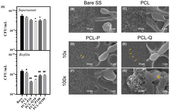 Colonization of bare SS, PCL and bioactive PCL coatings with P or Q compounds by C. albicans SC5314 incubated under simulated physiological conditions; graphical representation of CFUs/mL values obtained for each plate in the supernatant and biofilm (A), SEM micrographs of the bare SS plate (B), and PCL (C), PCL-P10 (D), PCL-Q10 (E), PCL-P100 (F) and PCL-Q100 (G) coatings, where the right hand-side SEM images are magnified yeast cells; Bars represent average errors and * or # p-values below 0.05 when compared with the corresponding control, while ## p-values below 0.001; Arrow marks point for isolated yeast cells; cross marks for particles predominantly composed by silver.