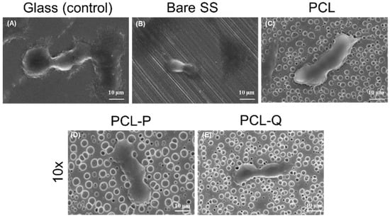 Characterization of the fibroblast colonizing the PCL coatings; SEM micrographs of fibroblasts colonizing the glass surface (A) that served as a positive control and of the plates, Bare SS (B); PCL (C); PCL-P10 (D) and PCL-Q10 (E) coatings.