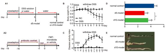 A total of 27 eight-week-old female C57BL/6J mice were provided ad libitum access to drinking water with 5% DSS (36–50 kDa; MP Biomedicals, Irvine, CA, USA) for 5 days to establish a colitis mouse model. They then received normal drinking water for an additional 5 days. A total of 9 eight-week-old female C57BL/6J mice had no treatment throughout the whole experiment to set a normal control. The mice were euthanized by CO2 asphyxiation and blood, colon tissue and colonic contents of the colitis mouse model were collected on day 5 (d 5 model, n = 9; donor mice for microbiota transplantation experiment, n = 9) and day 10 (d 10 model, n = 9); colon tissue and colonic contents of the normal control were collected on day 10. (Figure 1A). Body weight, stool consistency and degree of intestinal bleeding were measured daily. The scoring system displayed in Table S1 was described by Wirtz et al. [6].