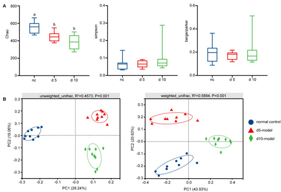 As rodents are coprophagic, the gut microbiota of mice in the same cage will progressively become homogeneous over time. In order to avoid this, mice were randomly selected from multiple cages each time for sample collection. Significantly decreased richness diversity, assessed by Chao, were noted across the d 5 and d 10 models (Figure 3A). However, no differences in Simpson and Berger–Parker dominance indices were noted between groups, which indicated that the abundance of dominant species in each group was basically the same. (Figure 3A).