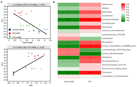 Correlation between specific microbiota and disease indicators. (A) Linear regression relationship between microbiota and inflammation-associated parameters. (B) Correlation matrix between specific microbiota genera and inflammation-associated parameters (Spearman correlation). * p < 0.05, ** p < 0.01, *** p < 0.001, means the correlation between horizontal and vertical coordinates is significant.