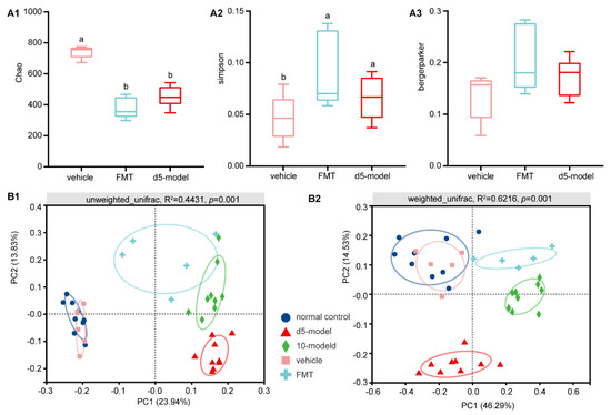 In addition to colitis symptoms in FMT mice, community evenness and richness diversity significantly decreased compared with the vehicle mice (Figure 6A). However, no differences in the Berger–Parker dominance index were noted (Figure 6A). Similarly, PCoA revealed clear clustering based on both unweighted UniFrac and weighted UniFrac metrics (Figure 6B; p = 0.001, PERMANOVA).