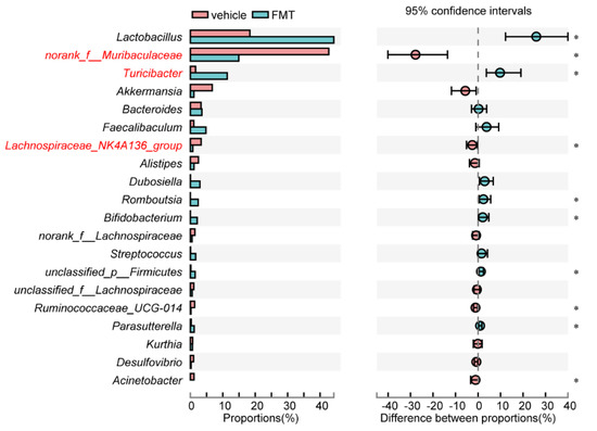 Relative abundances of the top 20 genera. The red font indicates there was also a significant difference in the Figure 4 association analysis of the previous experiment. * p < 0.05.