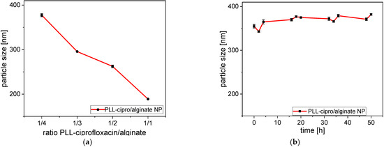 (a) Dependence of the size of nanogels prepared with different PLL-ciprofloxacin/alginate ratios at RT in deionized water; (b) size of the nanoparticles (PLL-ciprofloxacin/alginate 1/3) as a function of incubation time in phosphate buffer saline (pH 7.4) at 37 °C. The particle size for the 1/3 mixture here was somewhat higher because of the buffer and the higher temperature.