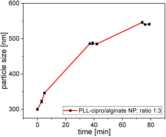 The degradability and release of ciprofloxacin were tested by incubating the system with trypsin (2.5 µg/mL). This enzyme is known to cleave PLL sequences [28]. The incubation led to a substantial increase in particle size (Figure 3). As was shown in Figure 2a, a decrease in the amount poly-l-lysine, thus a reduced PLL to alginate ratio led to an increase in nanoparticle size. Indeed, during incubation, trypsin converted PLL into monomer moieties, reducing the PLL concentration and as a direct consequence an increase in nanoparticle size was observed.
