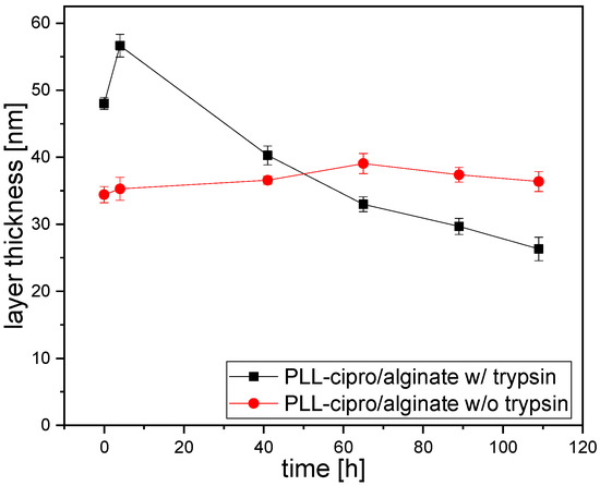 The nanoparticle suspensions can be used to coat the surface of titanium implants. The coating process comprises a spray or spin coating, drying, and rising [32,43]. During the coating the nanoparticles form a homogeneous layer [32,43,44]. While chitosan-based nanoparticles directly bind to the negatively charged titanium surface [43], for alginate-based nanoparticles with a negative zeta potential a surface charge reversal is necessary [32]. Here, adsorption of polyethyleneimine was used to obtain a positively charged surface. The thickness of the polyethyleneimine layer was determined by ellipsometry to be around 3.0 ± 1 nm. Subsequently a PLL-ciprofloxacin/alginate (ratio 1:3) nanoparticle dispersion was spray-coated resulting in a dry layer thickness of around 40 ± 6.5 nm. The coating on the titanium was then used for degradation and release experiments. For this purpose, coated titanium plates were incubated in PBS buffer with or without addition of trypsin (5 μg/mL) at pH 7.4 and at 37 °C. In the absence of enzyme the layer thickness does not change, and thicknesses between 35 and 40 nm are determined by ellipsometry for the dried coatings (Figure 5, red curve). For the incubation in buffer with trypsin another coating was prepared, which is slightly thicker at the beginning (~45 nm, Figure 5, black symbols). In this case, the incubation caused an increase in the thickness of the layer in the first few hours (Figure 5, black symbols). This was interpreted to be due the diffusion of trypsin into the layer. Then, over 109 h, a decrease of 45% of the initial layer thickness was observed, clearly indicating the enzymatic degradability of the coatings.