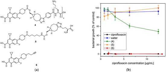 Conjugation of ciprofloxacin may affect its antibacterial efficacy. Therefore, the antibacterial effects of the conjugated ciprofloxacin 4 and two other derivatives of ciprofloxacin (5, 6, s. Figure 6a) were investigated against Staphylococcus aureus. This bacterial species was used because it is one of the pathogens that often caused orthopedic implant-associated infections [17].
