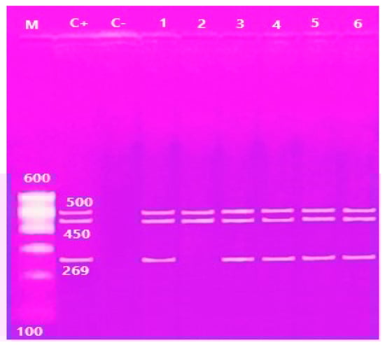 Agarose gel electrophoresis of multiplex PCR of trh (500 bp) tlh (450 bp) and tdh (269 bp) genes of V. parahaemolyticus. Lane M: 100 bp ladder, Lane C+: control positive, Lane C-: Control negative; Lanes 1, 2, 3, 4, 5 and 6: positive strains for trh genes; Lane 1, 2, 3, 4, 5 and 6: positive strains for tlh genes; Lanes 1, 3, 4, 5 and 6: positive strains for tdh genes.