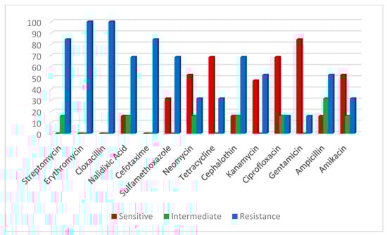 To verify the sensitivity of the test, 14 antimicrobials were used (Table 5). The single diffusion method was used to evaluate the antimicrobial susceptibility according to [99] for V. parahaemolyticus and [100] for A. hydrophila, and the results were applied according to [101]. The multiple antibiotic resistance (MAR) index for each strain was done according to the equation stipulated by [83,102,103] as follows: MAR index = number of resistance/total number of antibiotic.