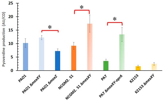 The MexXY multidrug efflux system decreased pyoverdine production in P. aeruginosa. Pyoverdine production was calculated by dividing the fluorescence value (arbitrary units, AU) by cell density (CD). The error range shown in the bar graph is the standard error (n = 5). * Indicates p < 0.05.