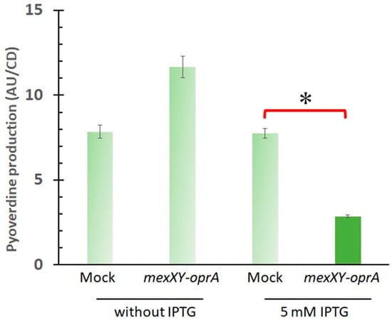 IPTG-induced mexXY-oprA expression decreased pyoverdine production in P. aeruginosa. Pyoverdine production was calculated by dividing the fluorescence value (arbitrary units, AU) by cell density (CD). Mock and mexXY-oprA on the horizontal axis indicate two complemented strains: PA7 ΔmexXY-oprA attB::pYM101 and PA7 ΔmexXY-oprA attB::pYM101-mexXY-oprA, respectively (Table 1). The error ranges shown in the bar graph are the standard error (n = 5). * Indicates p < 0.05. Cultures were supplemented with 5 mM IPTG by addition to Pseudomonas agar F to drive the T7(A1/04/03) promoter expression system fully [12,19].