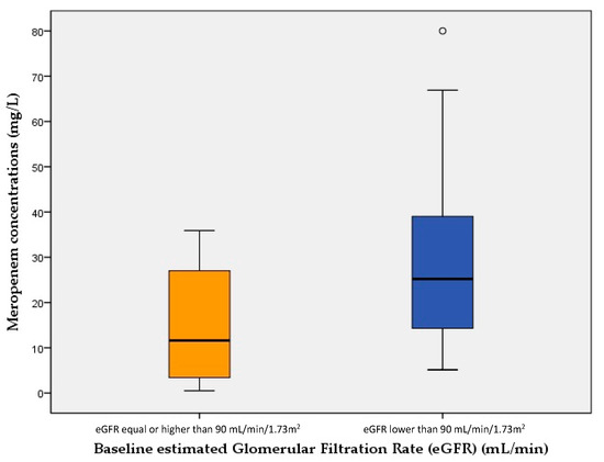 Meropenem plasma concentrations at steady state (mg/L) of patients with a baseline estimated Glomerular Filtration Rate (eGFR) < 90 mL/min and those with an eGFR ≥ 90 mL/min. The boxes represent the 25th, 50th and 75th percentiles.
