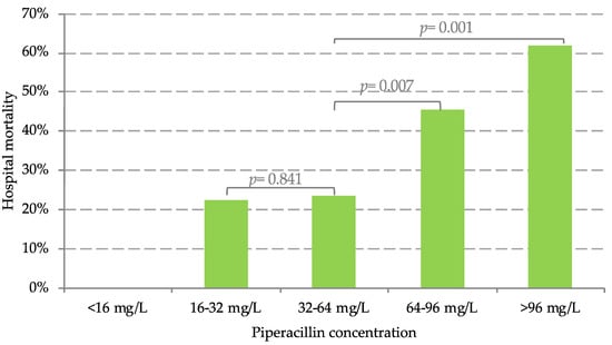 Distribution of hospital mortality rates. Hospital mortality rates over piperacillin concentration within 48 h after onset of treatment. Statistical analysis was performed using the chi-square test. Significant levels were considered as p ≤ 0.05.