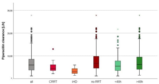 Observed piperacillin clearance. Distribution of the observed piperacillin clearance given in L/h of all patients (n = 335), patients with CRRT (n = 35), patients with iHD (n = 42), patients without RRT (n = 258), in the first 48 h (n = 179) and after 48 h (n = 156).