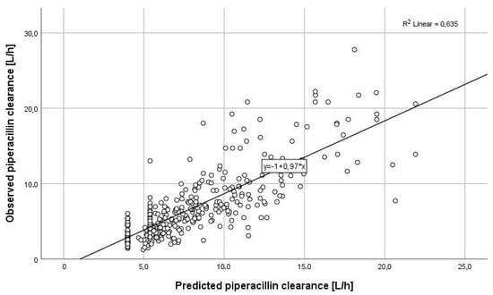 Piperacillin clearance predicted by CADDy versus observed piperacillin clearance within the first 48 h (r2 = 0.635). The solid black line shows the linear regression line of fit. The estimates of bias and precisions were also acceptable (0.30 and 1.30).