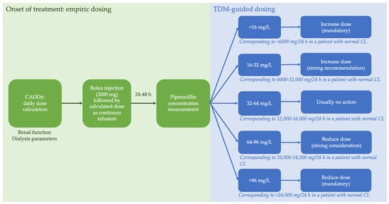 Dosing procedures. Therapeutic drug monitoring (TDM)-based dose adaptation strategy for continuous infusion. CADDy Calculator to Approximate Drug-Dosing in Dialysis; CL piperacillin clearance; TDM Therapeutic drug monitoring.