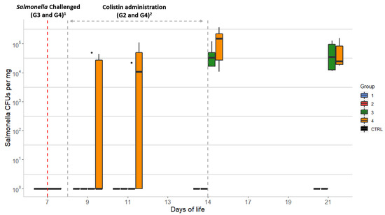 Evolution of Salmonella counts over 21 days in chick caecal samples: CTRL: control group; Group 1 (G1): animals without colistin nor Salmonella challenge; Group 2 (G2): colistin administered; Group 3 (G3): Salmonella challenged; Group 4 (G4): colistin administered and Salmonella challenged. Dots represent outliers; 1 Salmonella challenge started at D7 for groups G3 and G4 (sampling from D7 was performed before the challenge was started); 2 Colistin was provided to chicks from groups G2 and G4 from D8 to D14.