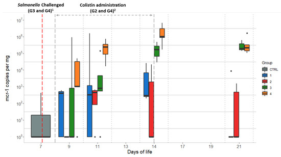 Quantitative qPCR data of mcr-1 gene copies/mg obtained per day of life of the chicks for each studied group: Group 1 (G1): animals without colistin nor Salmonella challenge; Group 2 (G2): colistin administered; Group 3 (G3): Salmonella challenged; Group 4 (G4): colistin administered and Salmonella challenged. Dots represent outliers; 1 Salmonella challenge started at D7 for groups G3 and G4 (sampling from D7 was performed before starting the challenge); 2 Colistin was provided to chicks from groups G2 and G4 from D8 to D14.