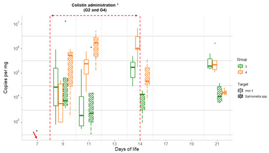Comparison between qPCR data for Salmonella and mcr-1 obtained throughout the study for the challenged groups (G3 and G4): Group 3 (G3): Salmonella challenged; Group 4 (G4): colistin administered and Salmonella challenged. Dots represent outliers; 1 Colistin was provided to chicks from group G4, from D8 to D14; * Salmonella challenge started on D7 for groups G3 and G4 (sampling from D7 was performed before starting the challenge).