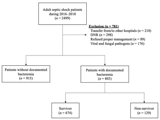 During the assigned study period, 2499 adult septic shock patients were treated in the ED of our hospital. We excluded 781 of these patients from further analysis due to a transfer from/to other hospitals (N = 218), a ‘do not resuscitate’ (DNR) order (N = 298), a refusal of treatment (N = 89), and infection with viral or fungal pathogens (N = 176). The remaining 1718 cases were initially enrolled in our septic shock cohort. Among these cases, 803 (46%) patients with documented bacteremia were finally included in our present analyses (Figure 1). The median age of this population was 67.0 years (range, 59.0–75.0) and 474 patients (59.0%) were male. The overall 28-day mortality rate was 16.1%.