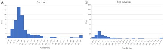 Distribution of the TTP values according to the 28-day mortality ((A) survivors and (B) non-survivors). Abbreviations: TTP = Time-to-positivity.