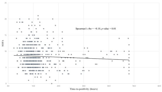 The median TTP in our blood culture-positive septic shock patients was 10.1 h (IQR, 8.2–13.3 h). The TTP distribution for our study patients is shown in Figure 2. Even though the TTP was found not to differ between the survivor and non-survivor groups (10.2 vs. 9.4 h, p = 0.35), a shorter TTP did show a weak negative correlation with a higher SOFA score (Spearman’s rho = −0.10, p < 0.01; Figure 3).