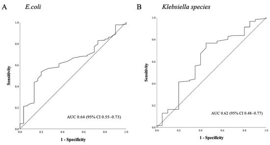 When stratified by the isolated bacterial pathogen, we found that the TTP in the Escherichia coli or Klebsiella bacteremia subgroups showed a significant difference between the survivors and non-survivors. The baseline characteristics of the Escherichia coli and Klebsiella bacteremia patient populations are presented in Tables S1 and S2, respectively. The TTP was shorter in the non-survivors in both of these subgroups (9.8 vs. 8.6 h, p = 0.01 for Escherichia coli, Table S1) (9.8 vs. 8.6 h, p = 0.03 for Klebsiella species, Table S2). In septic shock cases with Escherichia coli bacteremia, ROC analysis revealed that a cut-off of 10 h had the best sensitivity and specificity for predicting the 28-day mortality (84.4% and 42.0%, respectively). The AUC was 0.64 (95% CI 0.55–0.73, p = 0.01; Figure 4) and a TTP shorter than 10 h was associated with a 28-day mortality outcome in this group (OR 4.06; 95% CI 1.51–10.88, p < 0.01). In the Klebsiella bacteremia subgroup, we found that the optimal cut-off for the TTP was 8 h, with a 34.5% sensitivity and 80.9% specificity. The AUC in this case was 0.62 (95% CI 0.48–0.77, p = 0.07; Figure 4). However, a TTP shorter than 8 h was not significantly associated with a 28-day mortality in this group (OR 2.22; CI 0.94–5.26, p = 0.07).