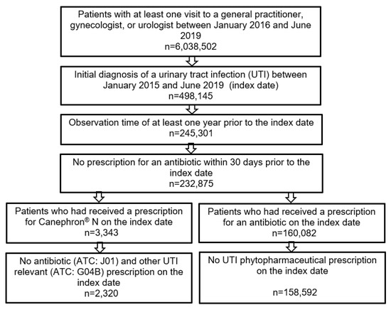 This retrospective cohort study includes patients with at least one diagnosis of acute cystitis (ICD-10: N30.0) or UTI (ICD-10: N39.0) between 1 January 2016 and 30 June 2019 in one of the GP, gynecologist, or urologist practices from which data were obtained. The first diagnosis documented during this period was considered the index date. Further inclusion criteria included at least 12 months of observation prior to this diagnosis, which was verified by the documentation of at least one visit to the physician in the period ≥365 days prior to the index date, and a prescription for either Canephron® N or Canephron® UNO or a standard antibiotic (ATC: J01) on the index date. Patients with an antibiotic prescription within 30 days prior to the index date, prescriptions of other herbal medications during the study period, or a prescription of both Canephron® and any antibiotic drug together on the index date were excluded. Patients were categorized into one of two cohorts: the Canephron® cohort, and the antibiotic cohort. Both cohorts were then compared with each other.