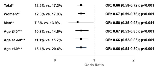 At least one renewed confirmed diagnosis of UTI was documented within 30–365 days after the index date in 12.3% of patients with Canephron® prescription and 17.2% of patients with antibiotic prescription. Canephron® prescription was associated with significantly lower odds of at least one renewed confirmed diagnosis of UTI within 30–365 days after the index date (odds ratio (OR): 0.66; 95% confidence interval (CI): 0.58–0.72; p < 0.001). This association was observed in men and women, and also in different age groups (Figure 2).