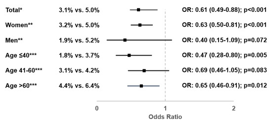 At least three diagnoses of UTI 2–365 days after initial diagnosis or at least two diagnoses of UTI 2–184 days after initial diagnosis were documented in 3.1% of patients with Canephron® prescription and 5.0% of patients with antibiotic prescription. Canephron® prescription was associated with significantly lower odds of frequent recurrent UTIs (OR: 0.61; 95% CI: 0.49–0.88; p < 0.001). This association was observed significantly or tendentially in men and women, and occurred in all age groups (Figure 3).