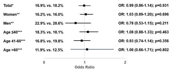 In total, 16.9% of patients with Canephron® prescription and 18.2% of patients with antibiotic prescription took at least 3 days of sick leave due to UTIs. There was no significant association between Canephron® prescription and the odds of taking sick leave (OR: 0.99; 95% CI: 0.86–1.14; p = 0.931), nor was any such association observed in the subgroups analyzed (Figure 4). A sensitivity analysis was performed to determine the association between Canephron® prescription and the probability of a sick leave of at least 7, 10, or 14 days. No significant associations were observed in the multivariable regression models, and no differences were found between the Canephron® and antibiotic cohorts (OR: 1.01 (95%CI: 0.85–1.19; p = 0.949) for ≥7 days: OR: 1.04 (95% CI: 0.86–1.25; p = 0.703) for ≥10 days, OR: 1.06 (95% CI: 0.86–1.31; p = 0.584) for ≥14 days.