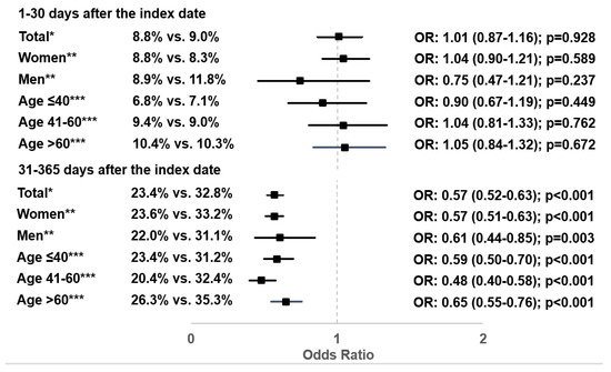 Association between Canephron® prescription and probability of antibiotic prescription 31–365 days or 1–30 days after the index date (Canephron® versus antibiotic). * Multivariable logistic regression adjusted for age, sex, health insurance coverage, practice specialty, and CCI. ** Multivariable logistic regression adjusted for age, health insurance coverage, practice specialty, and CCI. *** Multivariable logistic regression adjusted for sex, health insurance coverage, practice specialty, and CCI.