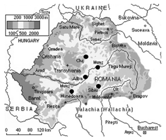 Romanian map highlighting the propolis sampling areas (Alba—S1, Cluj—S2, Hunedoara—S3, Sibiu—S4, Mureș—S5).