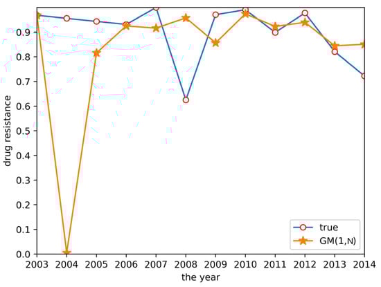 According to the grey system theory proposed in Section 2.2.1, a GM(1,1) model was established to predict the drug resistance data for E. coli to sulfafurazole. The predicted results are shown in Figure 3. Although the fitting effect in the previous years was good, the prediction accuracy of the later data was low, and the prediction in 2008 and 2014 showed a big difference between the predicted and actual data. It was obvious that the GM(1,1) model did not work well enough to predict these drug resistance data.