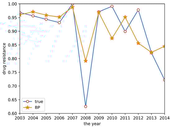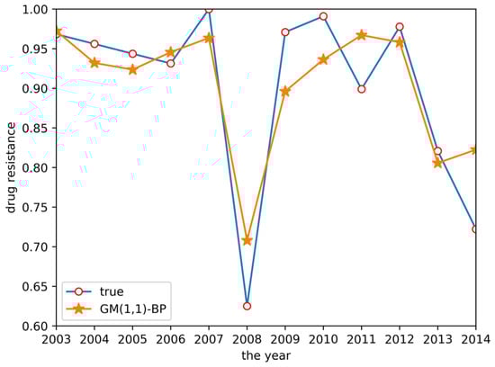 From the two tables above, GM(1,1) had a higher prediction accuracy for the trend of the initial data and GM(1,N) had a higher prediction accuracy for the trend of the later data in the time series, but the grey system models exhibited lower prediction accuracy for the overall data, with the R2 of both models lower than 0.5 and an RMSE higher than 0.1. The variation trend predicted by the BP neural network was similar to the true values, but with a low variation range and a low R2 of 0.5147, making it difficult to accurately predict the resistance data. GM(1,1) had a higher prediction accuracy for the trend of the initial data and GM(1,N) had a higher prediction accuracy for the trend of the later data in the time series, but the grey system models exhibited lower prediction accuracy for the overall data, with an R2 of both models lower than 0.5 and an RMSE higher than 0.1. The variation trend predicted by the BP neural network was similar to the true values, but with a low variation range, and an R2 of 0.5147, making it difficult to accurately predict the resistance data. Finally, the GM(1,1)-BP neural network model incorporating both the GM(1,1) and BP neural network realized an accurate estimation of drug resistance data, with an R2 of 0.7830 and an RMSE of only 0.0527. The relative error between the predicted result and the real value in 2014 was 13.9%. Compared with other methods, the accuracy of the GM(1,1)-BP neural network model was significantly improved, allowing for excellent drug resistance data prediction.
